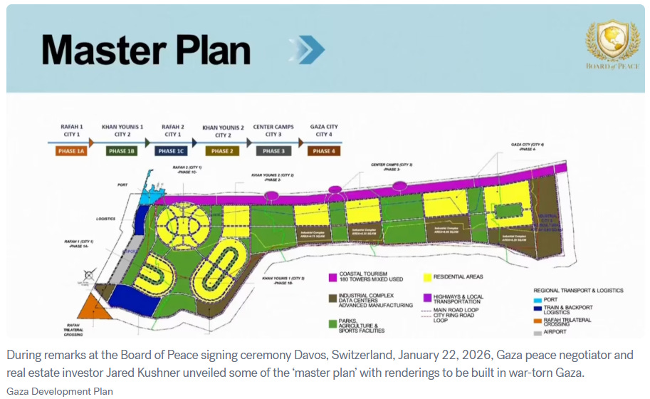 Trump’s Gaza Plan: The ultimate return on Rowan’s political investment came post-election. Trump appointed him to the boards overseeing Gaza’s long-term stabilization–a so-called “Board of Peace” that has been criticized for excluding Palestinian voices. Trump’s “Master Plan,” is a vision of sweeping commercial redevelopment: 170 residential towers, coastal tourism, and, crucially, industrial zones for data centers and advanced manufacturing.